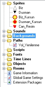 Delete : Seçili kaynak dosyasını veya klasörü silmenizi sağlar. Yalnız dikkat edin, ana klasörler silinmez (Kaynak gezginindeki sprites, sounds, paths, rooms vs.).