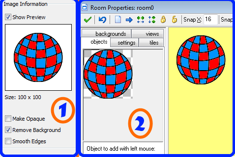 Yani artık eskiden yeşil olan yerler spritenin arkasında kalan yerleri gösterecektir. Bunu yuvarlak spritelerde bolca kullanacaksınız. Şimdi yapmanız gereken resmi kaydetmek, ancak kaydederken “.bmp” uzantılı kaydetmeyi unutmayın. Şimdi de Game Maker’ı açın ve spritemizi Load Sprite ile yeni bir spriteye yükleyin. Ancak dikkat edin, yüklerken “Remove Background” tiki işaretli olmalıdır. Bu, alttaki resmin 1 nolu kısmında gözükmektedir. 2 nolu kısımda ise spritenin bir odaya konmuş hâli var. Görüldüğü gibi köşeler artık arkaplanı gösteriyor, yani sonuca ulaştık. Resmi inceleyebilirsiniz :