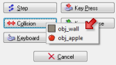 Şimdi elmanın, oluştuğu zaman, sekiz yönden herhangi bir yönde 8 hızıyla ilerlemesini belirttik. Şimdi elma duvara çarpınca sekmesini sağlayacağız. Bunun için bir collision(Temas) event‘i gerek. Bu event iki obje birbiriyle temas edince gerçekleşir.