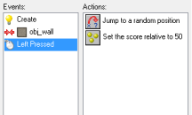 Duvar objesiyle Collision eventi ekleyin ve içine önceki gibi ‘bounce’ aksiyonunu ekleyin. Ardından Mouse eventinden Left pressed‘i ekleyin. İçine ‘jump to a random position’ aksiyonunu ekleyin. Skor aksiyonunu ekleyip (score sekmesinden) değeri 100 girin (Bu daha zor ve hızlı bir meyve, bu yüzden daha çok skor vermeli), ve sakın Relative kutucuğunu işaretlemeyi unutmayın ki skor öncekine eklensin. Son olarak ‘play a sound’ aksiyonunu ekleyerek (main1 sekmesinden) ses çalmasını sağlayın.