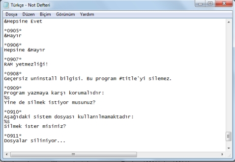 Tüm çevirileri yaptığınızı varsayıyorum (Zaten çok aşırı da yok.). Şimdi bir ipucu daha vereyim. “Uninstaller” sekmesinden isteğe bağlı oluşacak Uninkaystall dosyasının adını değiştirebilirsiniz, ama sondaki “.exe” yi atmayın sakın. Şimdi ilk aşama bitti. Dilimizi eklemek için en sol üstte “File” menüsünden “Export Wizard Texts” e basın. Ardından zaten orada Install Creator içindeki “Templ” klasörü açık gelmeli, orada dilimize isim vererek (Türkçe 🙂 ) dili kaydedin. İkinci ve son aşama ise o dosyayı elle düzenleyerek olacak (Normalde şimdi dilimiz ilk resimdeki listeye eklendi, ama uninstall dosyasının yazıları hâla İngilizce. Onları elle düzelteceğiz.). Windows gezgininden Install Creator içinde “Templ” a girip orada oluşturduğumuz dilin text (.txt) dosyasını açın. En altta, *0901* den *0914* e kadar cümleler İngilizce olup Uninstall dosyasına aittir. Onları da elle Türkçe yapıp işlemi kaydedin.