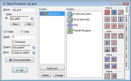 İkinci olarak çıkış (Hedef) objesini oluşturalım. Bu, oyuncunun ulaşması gereken objedir. Solid olmayan bir objedir. Buna bir bitiş çizgisi bayrağı resmi koymak güzel olur. Bu, hedefin o olduğunu oyuncunun kolayca anlamasını sağlar. Oyuncu bununla temasa geçince ise (Collision) sonraki odaya geçmeliyiz. Bu yüzden bu aksiyonu collision (Temas) olayının içine yerleştireceğiz (Main1 aksiyon sekmesinde yer alır.). Yalnız bu aksiyon eğer oyuncu son odayı bitirdiyse ileriki oda diye bir şey kalmayacağı için o zaman hata verir. Bu yüzden önce ileriki oda var mı diye kontrol edeceğiz, eğer varsa o odaya geçeceğiz. Yoksa da oyuna restart atacağız. Yani olay(Event) aşağıdaki gibi durmalıdır.
