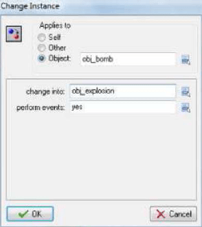 Tetikleyici objesi de epey kolay. Karakterle temasa geçince tüm bomba objelerini patlama objelerine dönüştürecek. Bu main1 sekmesinde Change Instance (Kopya Değiştir) aksiyonuyla yapılabilir. Tepeden, uygulanacak obje olarak bomba objesini seçmeyi unutmayın.