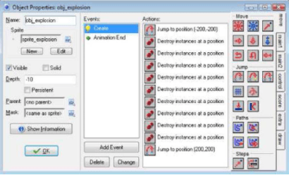 Patlama objesi sadece animasyonu gösterir. Animasyon bitince de kendini yok eder. (Patlama objesinin orjininin bombayla tam uyuşmasından emin olun.) Ayrıca bu obje dokunduğu her şeyi yok etmelidir. Bu biraz uğraştıracak. Öncelikle patlama objesinin patlamanın olduğu tüm alanlar test edilirken kendi kendini de yok etmemesi lazım, bu yüzden önce onu uzak bir yere ışınlıyoruz. Ardından main1 aksiyon sekmesinden Destroy at Position (Pozisyondakileri Yok Et) akiyonu ile patlamanın etkileyeceği tüm alanlarda ne var ne yok; yok edilmesini sağlıyoruz. Ardından da patlama objesini geri orijinal konumuna yerleştiriyoruz. (Burada örnekteki Destroy at Position aksiyonunun koordinatlarının (200+A veya 200-B ile başlamasının sebebi verilen örnekte patlama objesi en baştaki aksiyonda 200’e 200 pixel sol yukarı taşındığı içindir, yani orada asıl yapılan sanki patlama objesi hiç yer değiştirmemiş gibi patlamanın etki ettiği tüm koordinatlardaki objelerin elle patlatılmasıdır.)