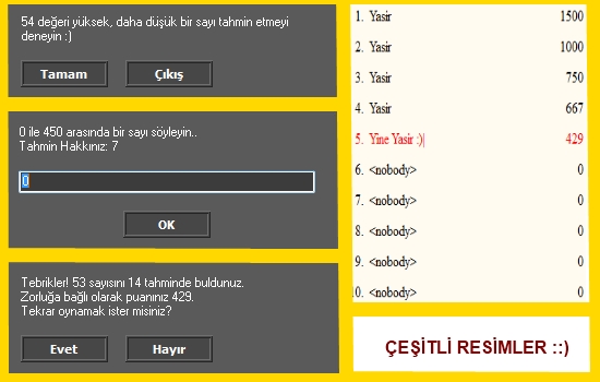 4) Artık “for()” döngüsünü bitirdik! Öncelikle kullanıcının tahmin hakkı var mı yok mu baktık, sonra eğer varsa kullanıcıdan bir sayı girmesini istedik ve girilen sayıyla işlem yapıp onun bilgisayarın rasgele ürettiği “global.sayi”ya göre sorgularını yapıp kullanıcıya ona göre geri dönüş yaptık. Ayrıca kullanıcıya her daim oyundan çıkma fırsatı da vererek gayet kullanıcı dostu bir oyun yapısı hazırladık. Şimdi Game Maker’a geri dönün ve yeni bir oda oluşturup içine objenizin bir kopyasını (instance) yerleştirin ve oyunu çalıştırın. Eğer kodları düzgün yapıştırdıysanız oyununuz gayet sorunsuz bir şekilde çalışacaktır. Bunlar da oyundan birkaç resim: