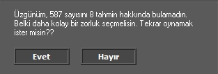 Belki daha kolay bir zorluk seçmelisin. Tekrar oynamak ister misin??","Evet","Hayır","")==2)