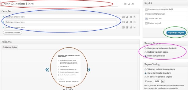 Burada “Enter Question Here” yazan yere anketin sorusu yazılır. Altındaki “Enter an answer here” yazan yere anketin cevapları yazılır. Eğer 3’ten çok şık olacaksa “Add New Answer” şıkkıyla yeni bir cevap bölümü daha oluşturabilirsiniz. Alttaki “Poll Style”den hazır bir anket stili seçilir. Ardından sağ taraftaki “Results Display” kısmından anketin sonuçlarının görünürlülüğü seçilir. Alt taraftaki “Repeat Voting” ile bir kişinin ankete defalarca katılıp katılamayacağı belirlenir. Son olarak da yukarıdaki “Oylamayı Kaydet” butonuna basılarak anket kaydedilir.