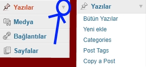 Yazılar: Sitenizdeki tüm yazıları görmeye, düzenlemeye veya yeni yazı eklemeye yarayan; yazılar için yeni kategoriler oluşturup onları da düzenleyebilmeye yarayan en temel buton kendisi.