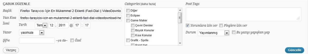 Buradan hızlıca yazınızın başlığını değiştirebilir; yazınıza parola atayabilir ya da yazınızı “Özel” yapabilirsiniz. Ayrıca yazınızı mevcut bir kategoriye atayabilir, yazınıza yeni “Post Tag”lar koyabilirsiniz. Son olarak; yazınızda yorum ve pinglere izin verebilir (Ben daima pingleri kapatıyorum, ne işe yaradığını bilmiyorum.) veya yazının yayımlanma durumunu değiştirebilir, yazınızı anasayfaya sabitleyebilirsiniz. Ardından “Güncelle” butonuna basmayı unutmayın.