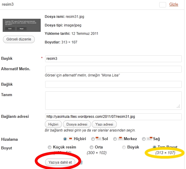 NOT: Yazınızı upload ettikten sonra, resimdeki turuncu daire içindeki sayısal değerlerin bir değere sahip olup olmadığını kontrol edin. Bazen hatalı bir resim dosyasını upload etmek sonucu o kısımda “(0X0)” yazar ve resim, yazınızı düzenlediğiniz editörde gözükürken yayınladıktan sonra sitenizde resim gözükmez. Böyle bir şey olursa resminizi “.jpeg” formatına çevirip tekrar upload etmeyi deneyebilirsiniz.