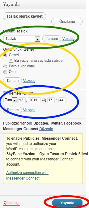 Son olarak resimdeki mavi daire içindeki kısım ile de yazınızı dilediğiniz tarihte, dilediğiniz saatte otomatik olarak yayınlayabilmenize yarar. Mesela internete sık giremiyorsanız ve mesela yılbaşına has bir yazı yazdıysanız ve yazının tam yılbaşında gösterilmesini istiyorsanız çok işinize yarar. Bu sadece bir örnekti..