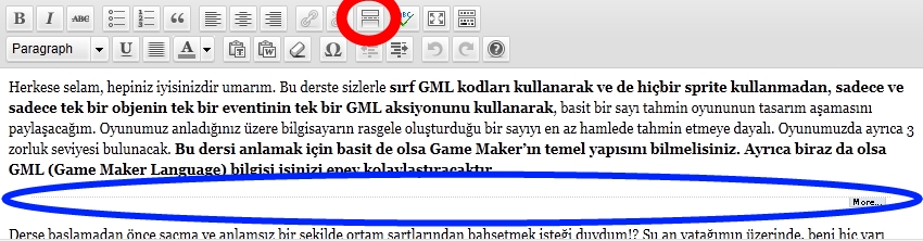 Öncelikle şundan başlayalım: Sitenizde bir yazı yazdınız ve de yazınız epey uzun. Sitenizin anasayfasında baktığınızda yazınızın tamamının anasayfada gözüktüğünü görüyorsunuz ancak bu da çok yer kaplıyor ve güzel gözükmüyor. Bunun için siz istiyorsunuz ki anasayfada yazınızın sadece ilk paragrafı ya da istediğiniz kısmı gözüksün, gerisini ise eğer ziyaretçileriniz yazıyı okumak isterse bir butona basarak okuyabilsin. Yani boş yere anasayfamızı kötü göstermeyelim ve ziyaretçilerimize hoş bir hizmet sunalım. Bunun için yazınızı yazın, ardından yazınızı kesmek istediğiniz noktaya gelin (Mesela ilk paragrafın sonu) ve ENTER tuşuyla yeni bir satıra geçin. Ardından alttaki resimdeki kırmızı daire içindeki butona (Insert More Tag) tıklayın. Resimdeki mavi daire içindeki gibi hafif saydam bir çizgi belirecek: