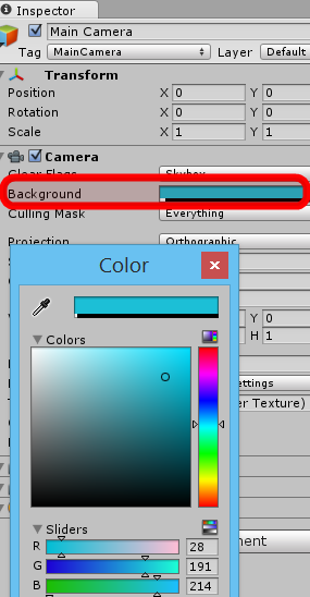 Eğer şimdi Game paneline geçiş yaparsanız arkaplanın boğuk bir mavi renkte olduğunu göreceksiniz. İsterseniz biz bu rengi biraz açalım. Bunun için sahnenizdeki Main Camera‘yı seçip Background değerini 28,191,214 yapın: