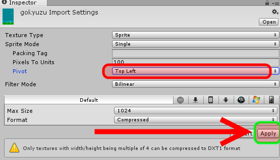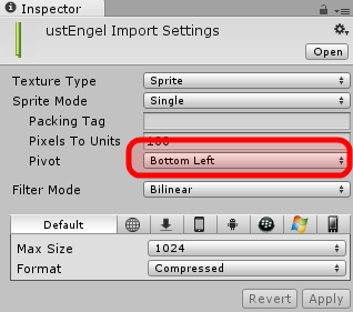 İlk önce gökyüzü ve toprak spritelerini uygun şekilde düzenleyelim. Bunun için Project panelindeki Sprites klasörünüzden gokyuzu sprite’ını seçin ve Inspector’dan Pivot özelliğini Top Left olarak değiştirin. Ardından aşağıdan Apply butonuna basın. Aynı şeyi toprak sprite’ı için de yapın: