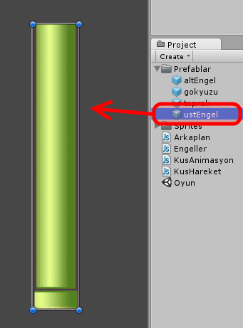 Oyunu başlatın ve hemen ardından pause edin. Scene paneline geçiş yapıp ustEngel objelerinin tekini seçin. Engelin tam ortasından geçen ve sahnenin yüksekliği kadar uzunlukta olan dikey bir temas alanı göreceksiniz. Görevimiz başarılıyla sonuçlandı!