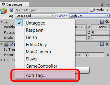 Kod kısmına geçmeden önce, Inspector‘dan Edge Collider 2D component’i altındaki Is Trigger seçeneğini işaretleyin. Böylece kuş çizgiyle temas edince çizginin içinden geçecek. Son olarak, çizgi objemize bir Tag (etiket) verelim. Bunu yapmamızın sebebi şu: kuş objemizdeki OnTriggerEnter2D hem ustEngel ve altEngel için hem de şimdi oluşturduğumuz Edge Collider 2D için çalışacak. Hangisiyle temas ettiğimizi anlamak için temas edilen objenin tag‘ına bakacağız. Objeye Tag vermek için Inspector‘dan Tag-Add Tag… yolunu izleyin: