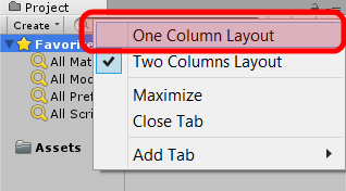 NOT: Bir alttaki paragrafı okumadan bu notu okumanızın önemli olduğunu düşünüyorum. Unity’nin yeni sürümleriyle beraber Project panelinin tarzı değişti. Artık iki farklı şekilde görebiliyoruz Project panelini: tek hücreli ve iki hücreli olarak. Yeni bir proje açtığınız zaman Project paneli otomatik olarak iki hücreli şekilde gelir ama ben bu yeni stili sevmiyorum ve eski tek hücreli stili kullanıyorum. Dersi anlatırken de tek hücreli stili kullanarak anlatıyorum. Eğer herhangi bir sıkıntı yaşamak istemiyorsanız siz de tek hücreli Project paneline geçiş yapın. Bunu yapmak çok kolay: Project panelinin sağında bir kilit simgesi, onun da sağında bir menü simgesi var. İşte o menü simgesine tıklayın ve One Column Layout seçeneğini seçin:
