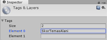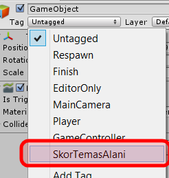 Şimdi Edge Collider 2D‘li objeyi tekrar seçin ve Inspector‘dan Tag olarak az önce oluşturduğumuz SkorTemasAlani tag’ını verin: