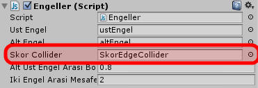 Engeller.cs scriptindeki işimiz bitti. Scripti kaydedin, Main Camera‘yı seçin ve Inspector‘dan Skor Collider değişkenine değer olarak SkorEdgeCollider‘ı verin: