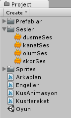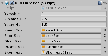 Scripti kaydedin ve FlappyBird‘ün Inspector paneline gelin. Buradan Kus Hareket (Script) component’indeki yeni eklediğimiz değişkenlere, uygun ses dosyalarını Project panelinden sürükleyerek değer olarak verin: