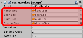 Sıra geldi script vasıtasıyla uygun sesleri uygun zamanda çaldırmaya. Bunun için KusHareket.cs scriptinin en başında şu dört değişkeni tanımlayın: