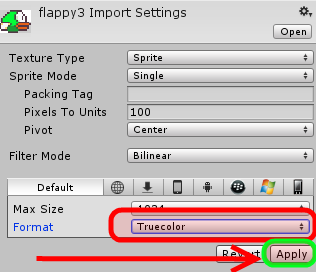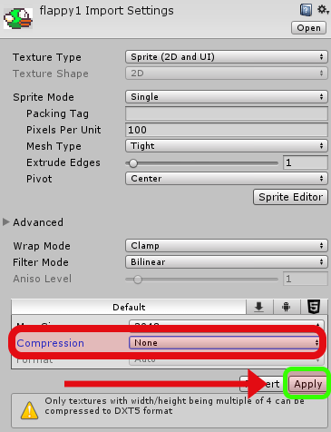 Sonra flappy1 spritesini seçip Inspector panelinde yer alan Compression kısmını None olarak değiştirin ve alttan Apply butonuna basın. Bu işlemi flappy2 ve flappy3 spriteleri için de yapın. Eğer bunu yapmazsak kuş biraz eğim aldığında etrafında istenmeyen siyah çizgiler oluşuyor ama artık böyle bir sorun yaşamayacağız.