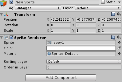 Kuşa animasyonunu vermek için script yazacağız. Scriptin başlıca avantajı, kuşun animasyon hızını istediğimiz gibi değiştirebilmek ve animasyonun oynama sırasına karar verebilmek (1-2-3-2-1-… diye). O halde önce kuşumuzu oluşturalım. GameObject-2D Object-Sprite yolunu izleyin. Ardından “flappy1” sprite’sini Assets klasöründen tutup Sprite Renderer‘daki Sprite kısmına sürükleyin: