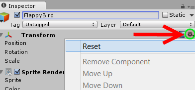 Bu aşamada kuş ekranınızda belirecektir. Eğer belirmemişse Scene panelinde biraz dışarı doğru zoom yapın. Ya da Hierarchy panelindeki New Sprite objesini seçip fareyi Scene paneline getirin ve klavyeden F tuşuna basın. Kamera kuşa odaklanacaktır. Şimdi Inspector panelinden New Sprite‘ın adını FlappyBird olarak değiştirin. Hemen sonrasında ise Transform componentinin sağında yer alan dişli çarka tıklayıp Reset‘e dokunarak kuşu 3 boyutlu uzayın tam merkezine (origin) yerleştirin: