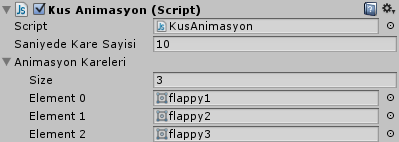 animasyonKareleri: Bu bir Sprite dizisi (array). Flappy Bird’in her bir animasyon karesine bir sprite diyoruz. Yani bu değişken kuşun kanat çırpma animasyonundaki kareleri depoluyor. Elimizde üç tane sprite var: flappy1, flappy2 ve flappy3. Şimdi Inspector’da Kus Animasyon (Script) yazan yerin altındaki Animasyon Kareleri‘nin üzerine tıklayın. Kendisi genişleyecektir. Gelen değerlerden Size‘ı 3 yapın. Bu değer array’de toplam kaç eleman depolayacağınızı belirtir. Şimdi sırayla flappy1, flappy2 ve flappy3 sprite’lerini Project panelinden sürükleyerek bu Element’lerin üzerine bırakın: