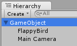 Kuşu neden henüz yatay eksende hareket ettirmediğimi merak ediyor olabilirsiniz. Öyle yaptım çünkü Flappy Bird oyununda bildiğiniz üzere kamera kuşu yatay eksende takip eder ama dikey eksende takip etmez. Yani kuş ne kadar yukarı ya da aşağı hareket ederse etsin kamera yukarı-aşağı oynamaz. Unity’de kameranın kuşu takip etmesinin en kolay yolu kuşu kameranın parent objesi olarak atamaktır. Böylece kamera hep kuşu takip edecektir. Ama bunun dezavantajı ise kamera kuşu gerçek anlamda takip edecektir, yani kuş yukarı-aşağı hareket ettikçe onunla beraber yukarı-aşağı inecek, kuşun eğimi değiştikçe kameranın da eğimi değişecektir. İşte bu duruma engel olmak için (kameranın kuşu sadece yatay eksende takip etmesi ve kuşla beraber eğim almaması için) biraz farklı bir hiyerarşi oluşturacağız.