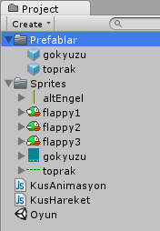 Şimdi sıra geldi kuşa animasyon vermeye. Bunun için yeni bir C# script oluşturun (Assets-Create-C# Script) ve adını KusAnimasyon koyun. Bu scripti Project panelinden tutup sürükleyerek Hierarchy‘deki FlappyBird objesine atayın. Artık scripti düzenlemeye hazırız. Scripte çift tıklayarak onu açın ve içini şöyle değiştirin: