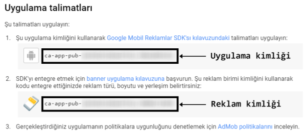 Reklam birim(ler)inizi oluşturduktan sonra Tamamlandı butonuna tıklayarak işlemi sonlandırın. Reklam birimleri menüsünden yeni oluşturduğunuz reklama tıklayın ve gelen ekranda sağ üstten Uygulama talimatları‘na basın. Burada gözüken uygulama kimliğinizi ve reklam birimi kimliğinizi bir yere not edin (ca-app-pub- kısmını da ilave etmeyi unutmayın!):