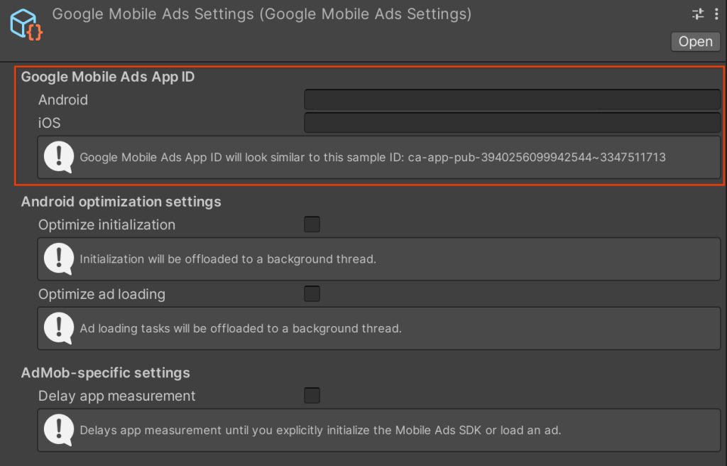 - Assets-Google Mobile Ads-Settings… yolunu izleyin. Inspector panelinde bir takım ayarlar gözükecek. Google Mobile Ads App ID‘nin altındaki boşluğa uygulama kimliğinizi girin (kimliğin başında veya sonunda boşluk karakteri olmasın! Kodlarınızda reklam kimliklerinizi kullanırken de başta veya sonda boşluk olmadığından emin olun):
