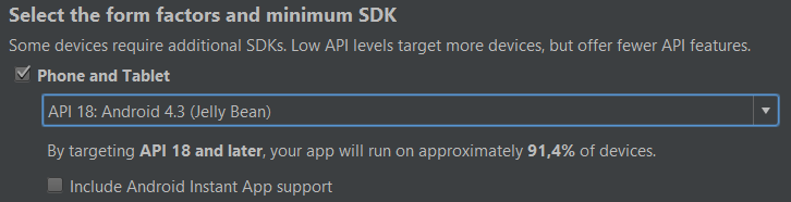 Sonraki ekranda Phone and Tablet altında yer alan API değerinin, Unity projenizin Player Settings-Other Settings‘inde yer alan Minimum API Level‘a eşit veya daha küçük olduğundan emin olun. Bu değer, pluginin desteklediği minimum Android sürümünü belirtmekte: