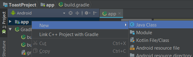 Yine sol tarafta yer alan Project sekmesindeki app modülüne sağ tıklayın ve New-Java Class yolunu izleyin: