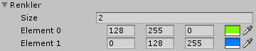 Yazdığımız bu script vasıtasıyla Color/Color32 array’lerinin elemanları da yeni stilde ekrana çizdiriliyorlar: