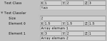 Değişkenlerimizin başında açılıp kapanabilir bir başlık bulunmakta (Test Class, Element 0, Element 1). Hem bu başlığı elle açmak zorunda olmak vakit kaybı hem de bu başlığın kapladığı 1 satırlık alan, Inspector’da yer israfı. Bu sorunları çözmek için, biz bu TestClass değişkenlerimizin şöyle görünmesini istiyoruz: