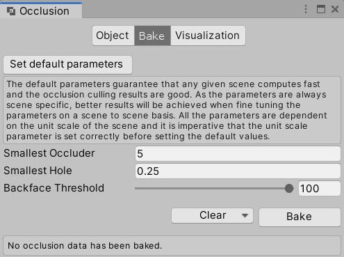 Ben kendi sahnemde Smallest Occluder‘ı 1.0 yaptım çünkü duvarlarımın hemen hiçbiri 5 birim büyüklüğünde değil, genel olarak 1 veya 1.5 birim büyüklüğündeler. Diğer parametreleri olduğu gibi bıraktım. Ancak eğer oyun bir şehirde geçseydi, binaların büyüklüğüne göre bu değeri 5’de bırakmak mantıklı olabilirdi. Değiştirdiğiniz parametreleri varsayılan değerlere döndürmek isterseniz, Set default parameters butonuna tıklayabilirsiniz.