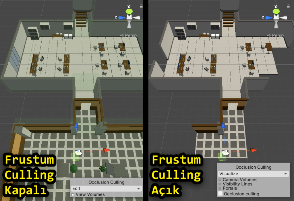 Occlusion Culling’in olayı, başka bir objenin arkasında kalan objeleri GPU’ya yollamamak olduğu için, sadece bu optimizasyondan verim alacağınız sahnelerde Occlusion Culling kullanın. Örneğin üstteki sahnede iki odayı duvarlar ayırdığı için, duvara doğru bakarken duvarın arkasında kalan objeleri çizmemek mantıklı bir tercih. Benzer şekilde, birçok binadan oluşan bir şehirde FPS veya TPS kamera açısıyla dolaşırken de Occlusion Culling oldukça faydalı olacaktır. Ama mesela izometrik kamera açısıyla oynanan bir oyununuz varsa, çoğu zaman Occlusion Culling işinize yaramayacak, boş yere performans yiyecektir.