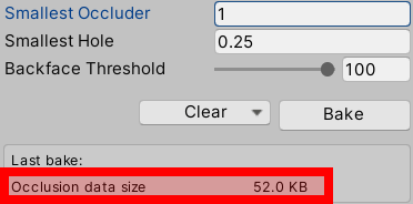 İşlem tamamlanınca, Occlusion Culling verisinin boyutunu, Bake butonunun altında görebilirsiniz: