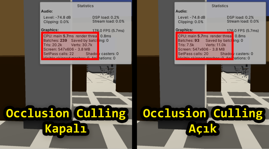 Şu anda, Camera component’indeki Occlusion Culling‘i açık olan kameralar otomatik olarak Occlusion Culling’den faydalanmakta. Kamerayı bir duvarın arkasına getirip ardından Game panelinin sağ üstündeki Stats‘ta yer alan değerlere bakarak bunu gözlemleyebilirsiniz: