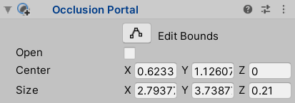 Buradaki Open değişkeni aktif iken, kapı açıkmış varsayılır ve arkasındaki objeler Occlusion Culling tarafından gizlenmez. Bu değişkeni oyun esnasında GetComponent<OcclusionPortal>().open = true; kodu ile değiştirebilirsiniz.