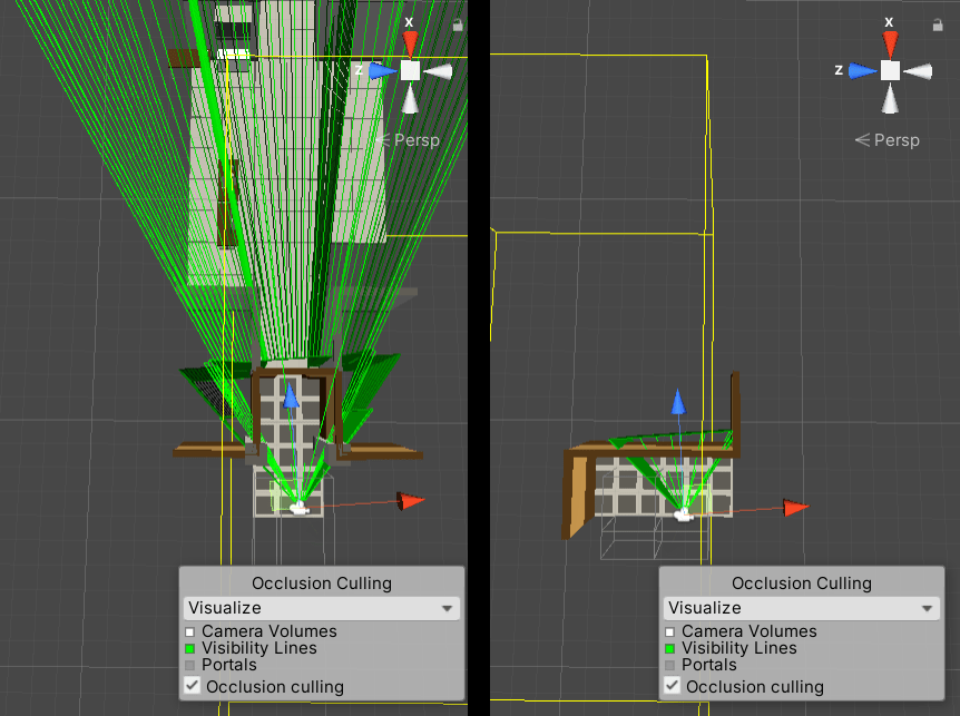 • Visibility Lines: Occlusion Culling sisteminin duvarları tespit etmek için attığı raycast ışınları yeşil renkte gösterilir: